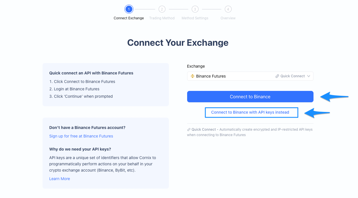لتوصيل البورصة التي تريدها بـ Cornix، يرجى تحديدها من القائمة المنسدلة. إذا لم تكن قد أنشأت حسابًا في البورصة بعد، فهناك رابط متوفر ليأخذك مباشرة إلى موقع البورصة حيث يمكنك إنشاء حساب.