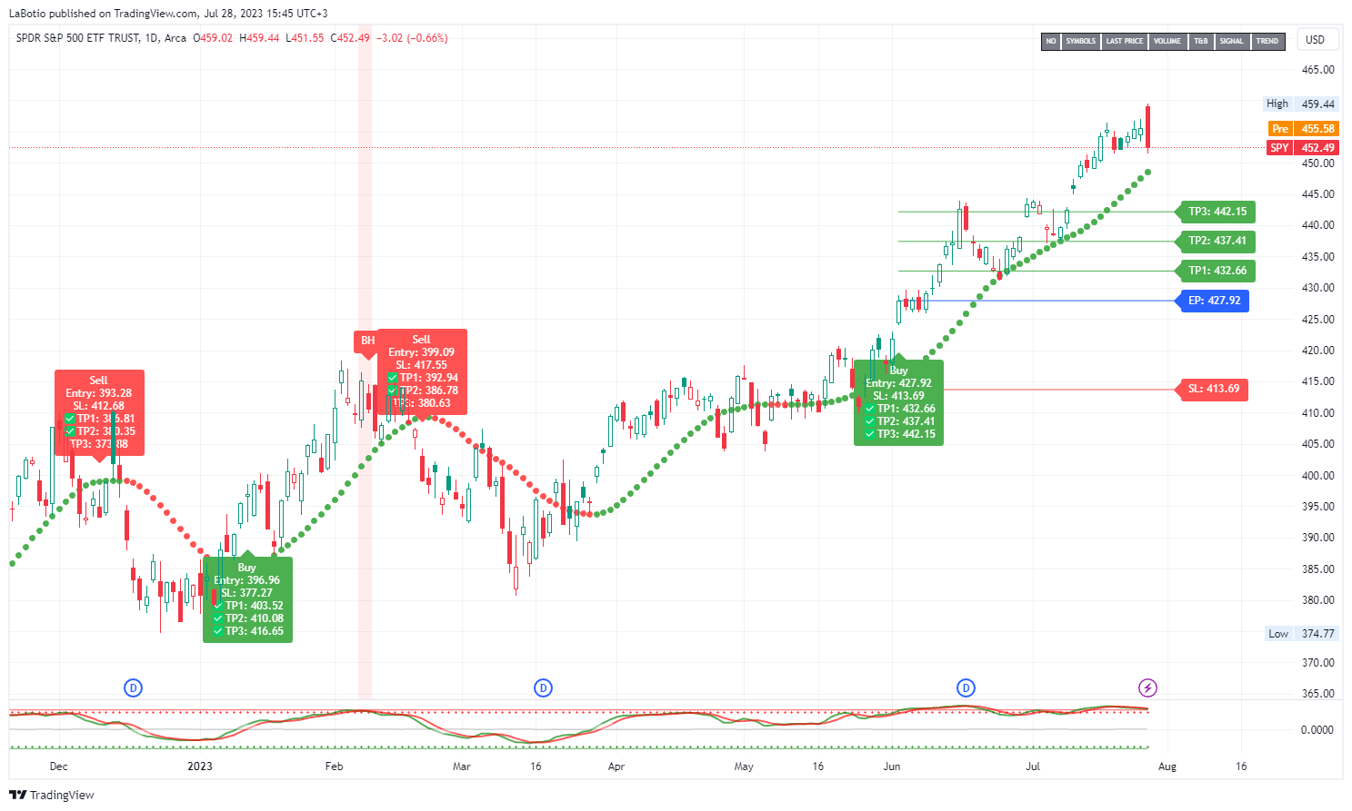 والان نستعرض نتائج مؤشرات لابوت التداول المتقدمة مع مؤشر سباي SPY في السوق الامريكي