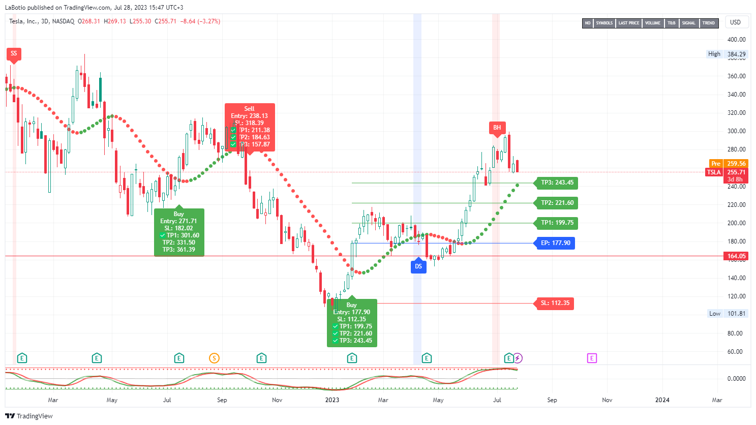 والان نستعرض أداء مؤشرات لابوت التداول المتقدمة مع سهم شركة تسلا في السوق الامريكي
