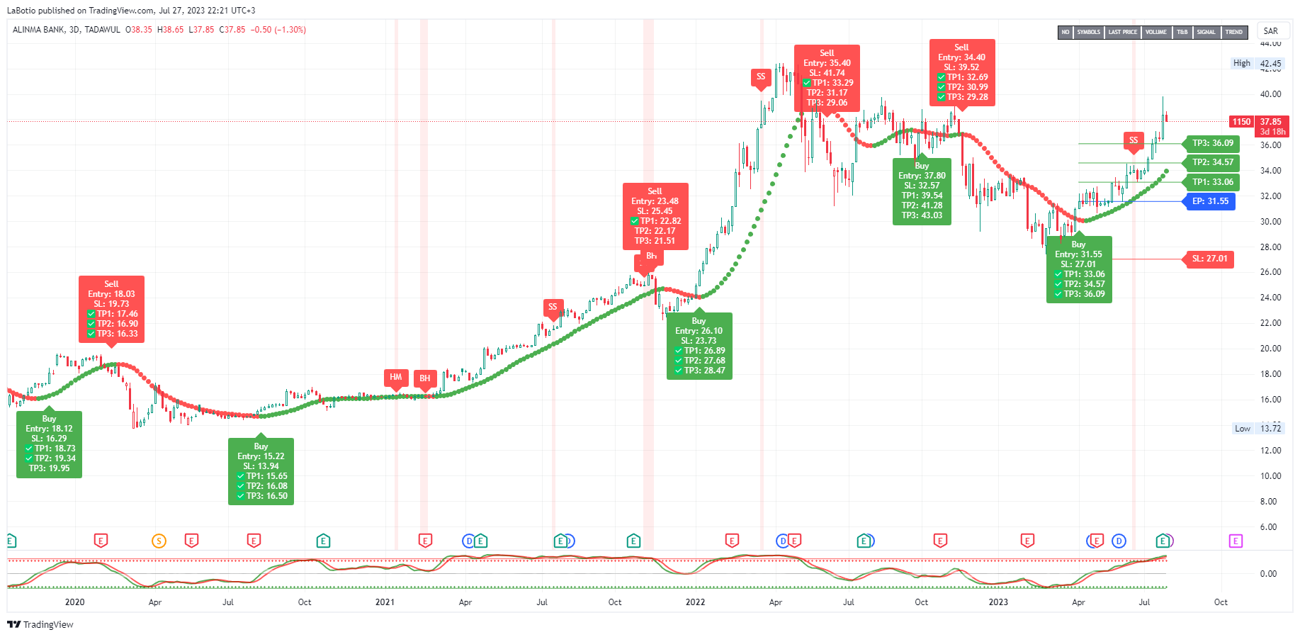 والان نستعرض نتائج مؤشرات التداول المتقدمة مع سهم مصرف الإنماء 1150 تاسي