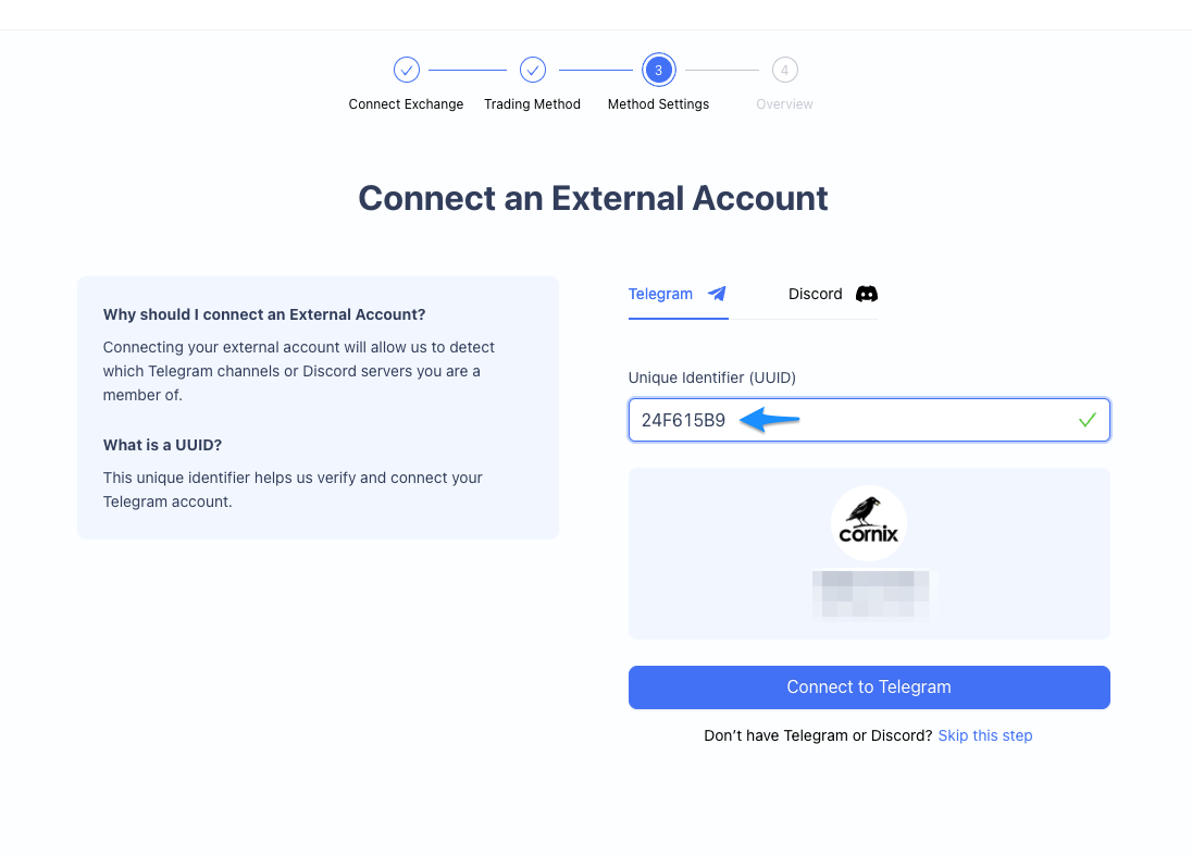 Linking your external account to Cornix will allow Cornix to discover which Telegram channels or Discord servers you are a member of. Let's see how we can complete the connection easily after choosing the Trading Method you want.